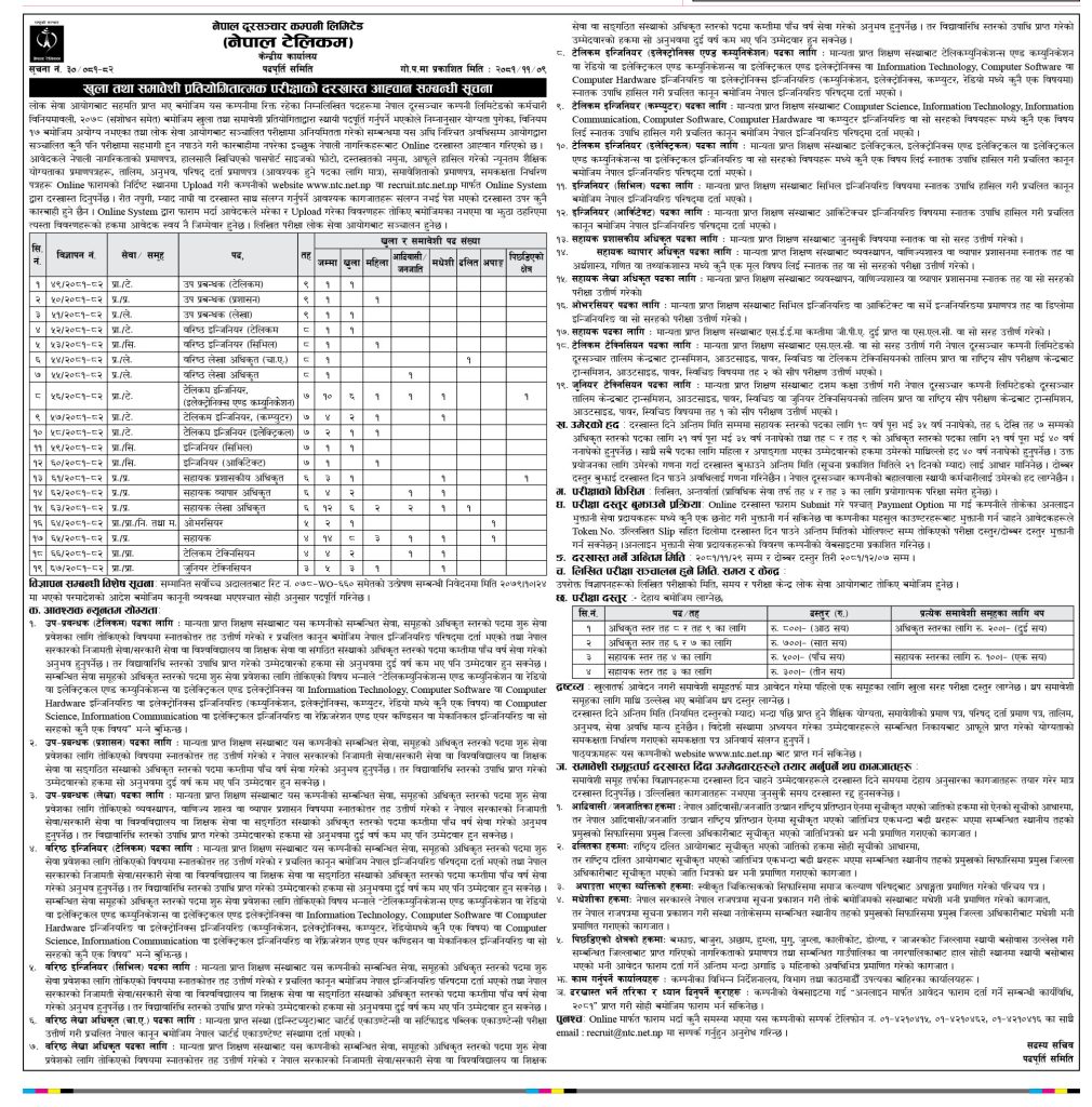 काठमाडौं । नेपाल टेलिकममा विभिन्न पदका ६९ जना कर्मचारीका लागि विज्ञापन खुलेको छ । खुला तथा समावेशी प्रतियोगिताबाट पदपूर्ति गर्नका लागि नेपाल टेलिकमले आज विज्ञापन खुलाएको हो ।