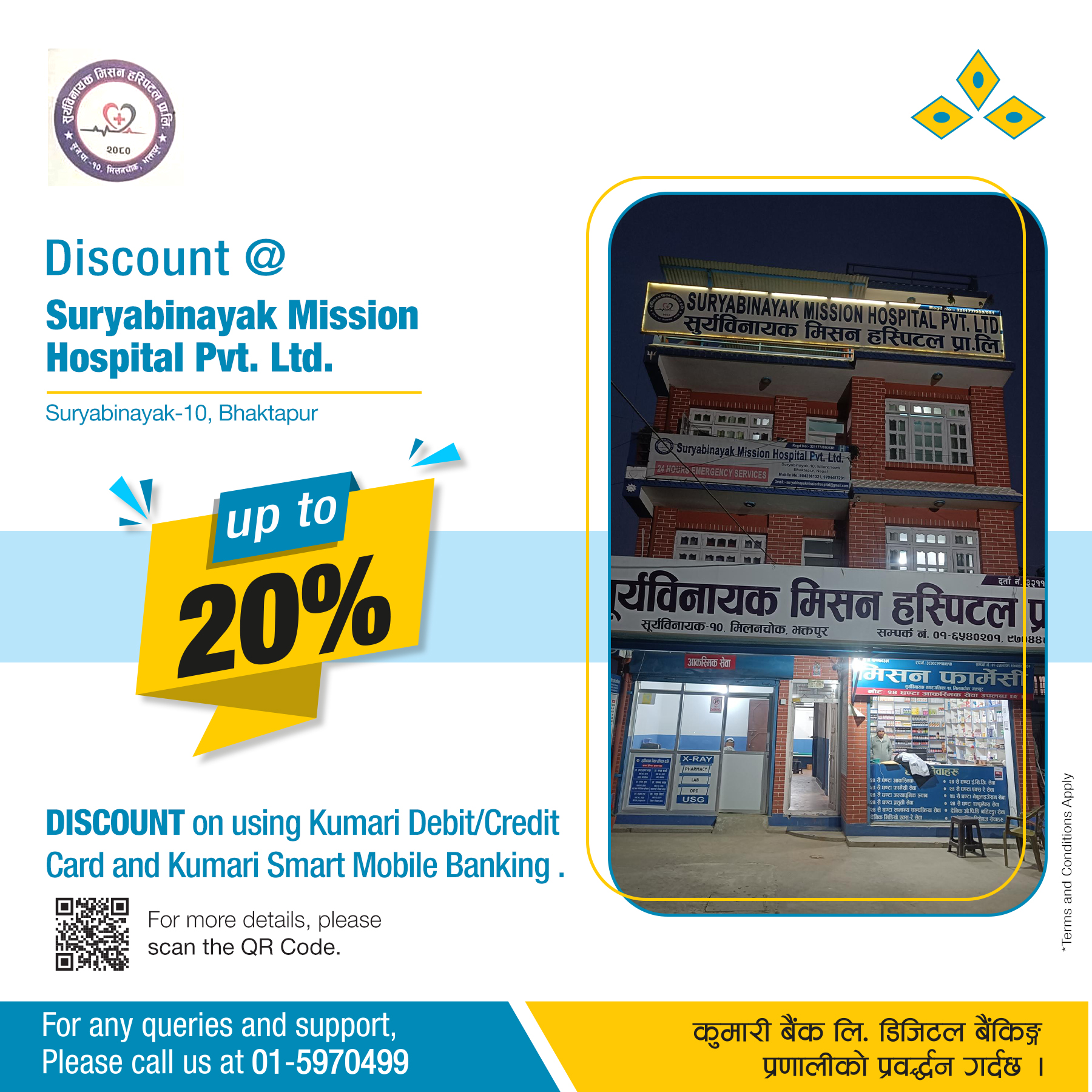 काठमाडौं। कुमारी बैंक लिमिटेड र सूर्यविनायक–१०, मिलनचोक, भक्तपुर, स्थित सूर्यविनायक मिसन हस्पिटलबीच कुमारी बैंक लिमिटेडका ग्राहक महानुभावहरुलाई हस्पिटलबाट प्रदान गरिने...